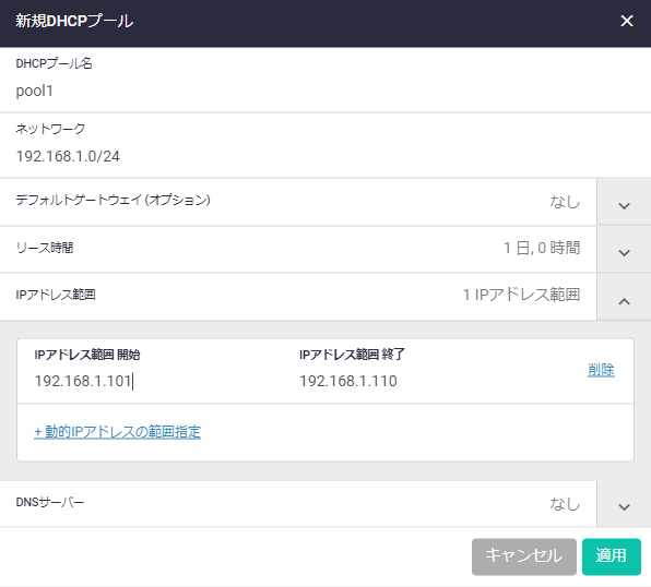 | pool1 | 192.168.1.0/24 | なし | 任意 | 192.168.1.101 | 192.168.1.110 | なし |