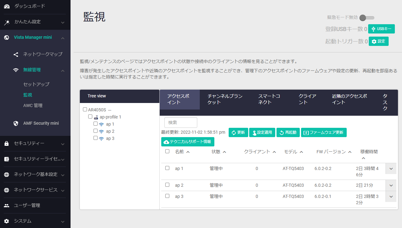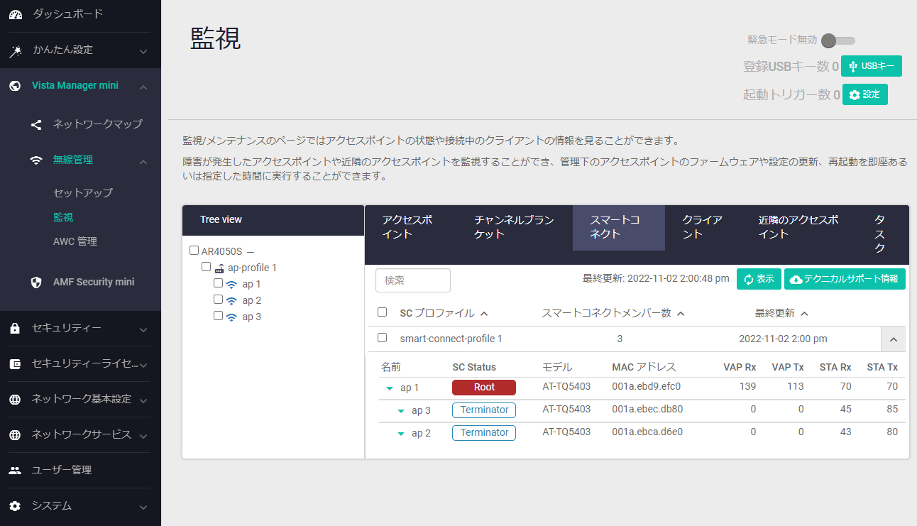 | 2 | AT-TQ5403 | DHCP:192.168.1.102(1) | 0000.5e00.5302 | サテライトAP |