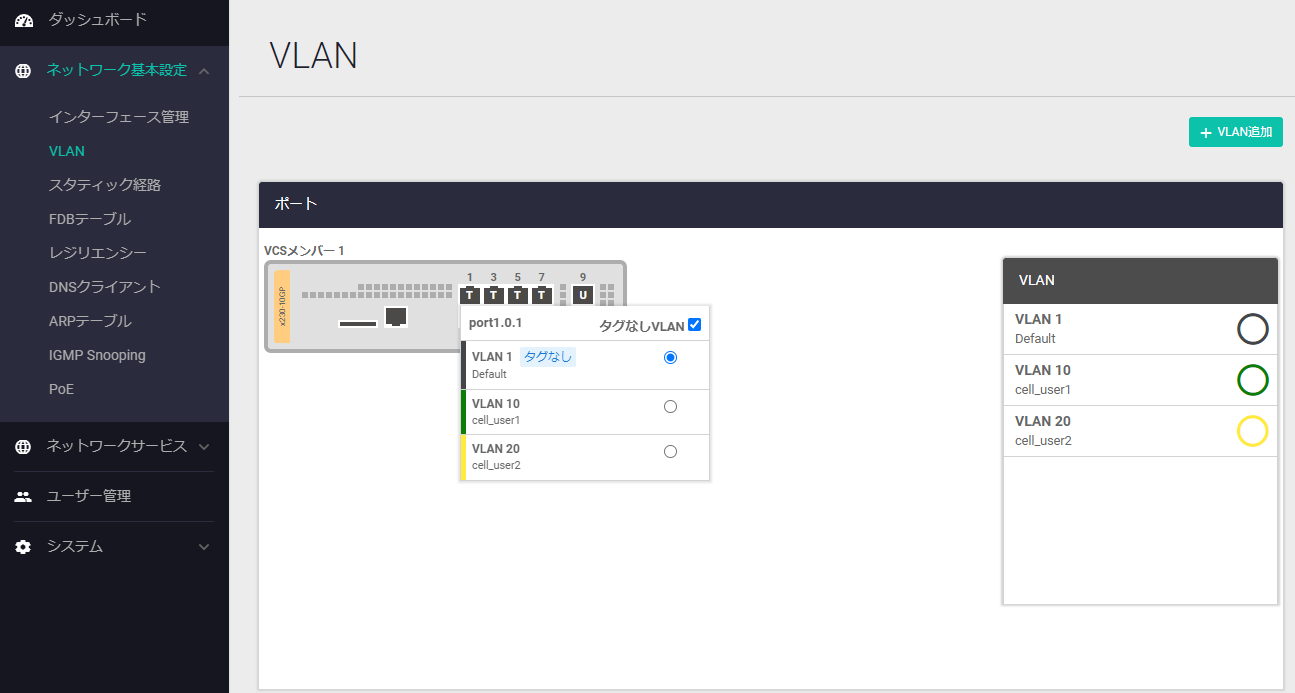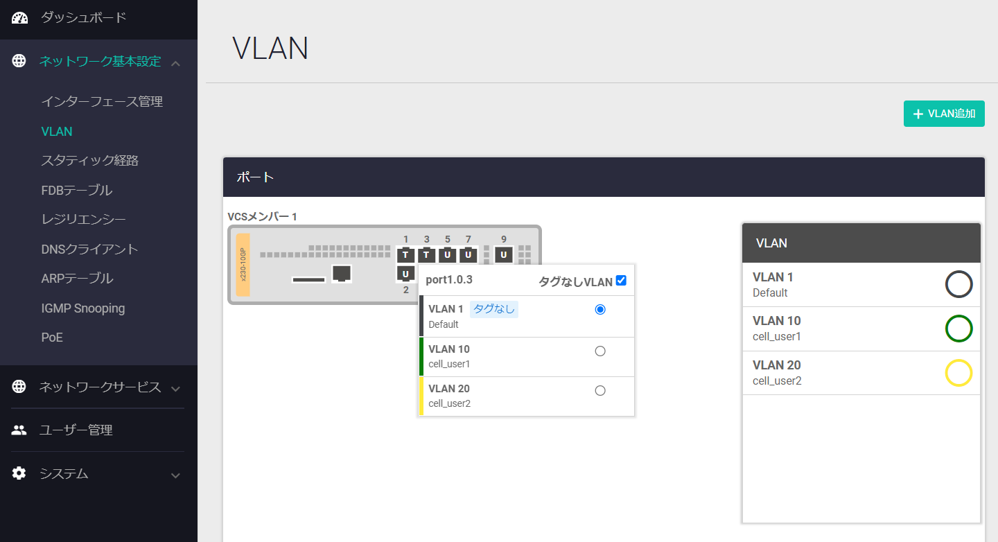 | 10 | 192.168.10.0/24 | ユーザーVLAN。無線ネットワーク wnet10 はこのVLANに所属する |