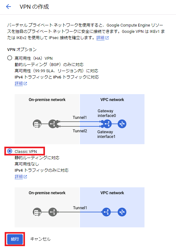 IPアドレス:vpn-gateway(「IPアドレスを作成」をクリックし、「新しい静的IPアドレスの予約」画面で名前に「vpn-gateway」を設定し「予約」をクリック)