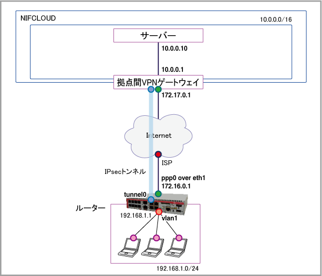 本例では本製品のLAN側サブネットとNIFCLOUDの仮想サブネットをL3VPN接続してIPトラフィックをルーティングします。
