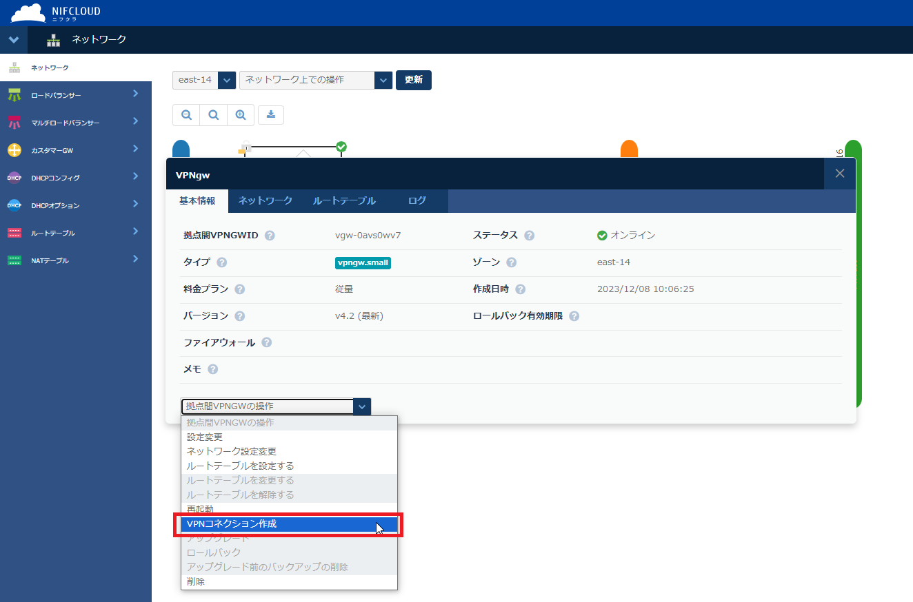 「拠点間VPNGWの操作」ドロップダウンから「VPNコネクション作成」を選択します。