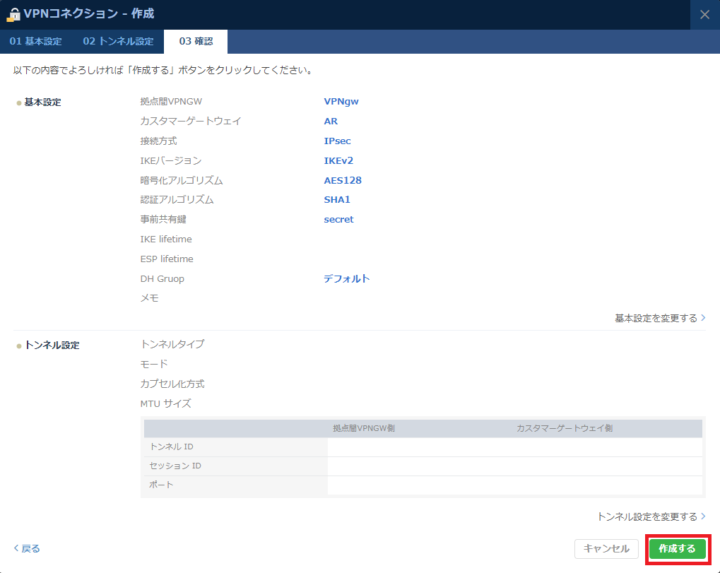 接続がIPsecの場合はトンネル設定の必要はないため、そのまま「確認へ」をクリックします。