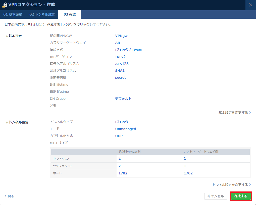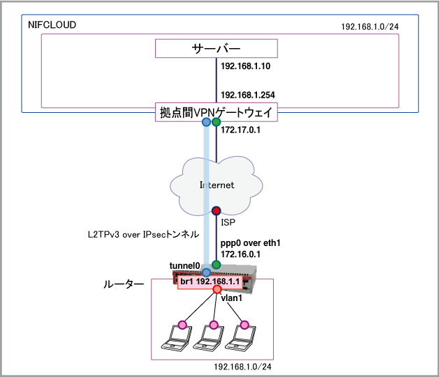 interface tunnel0 bridge-group 1 mtu 1500 tunnel source ppp0 tunnel destination 172.17.0.1 tunnel local id 1 tunnel remote id 2 tunnel protection ipsec profile nifcloud-ipsec tunnel mode l2tp v3