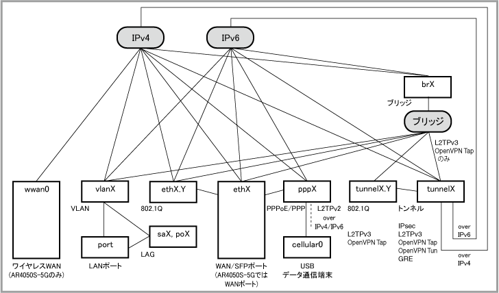 L2TPv3とOpenVPN Tap(L2)トンネルインターフェースはおもにブリッジング用、IPsec、OpenVPN Tun(L3)、GREトンネルインターフェースはIPv4、IPv6のルーティング用インターフェースとして使用します。