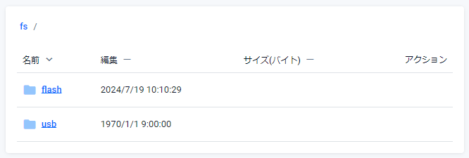 Note機器に接続している外部メディア内のファイルを参照する場合は、ファイル一覧のラベル上にある「/fs」をクリックし、該当の外部メディア名(usb)を選択してください(次図参照)。デフォルトでは内蔵フラッシュメモリー(flash)が選択されています。