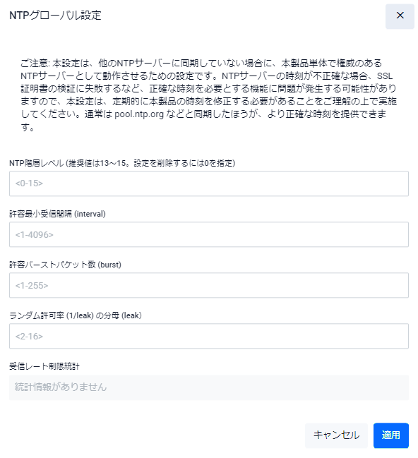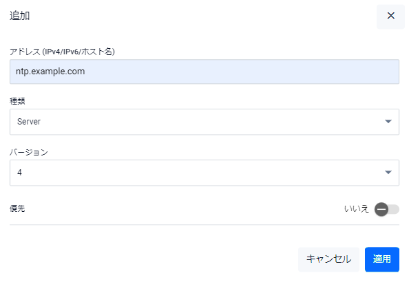 | NTPサーバー | NTP同期先の一覧が表示されます。「追加」ボタンを押すとNTP同期先の追加を行うダイアログが表示されます。右端の削除ボタンを押すと該当同期先が削除されます |