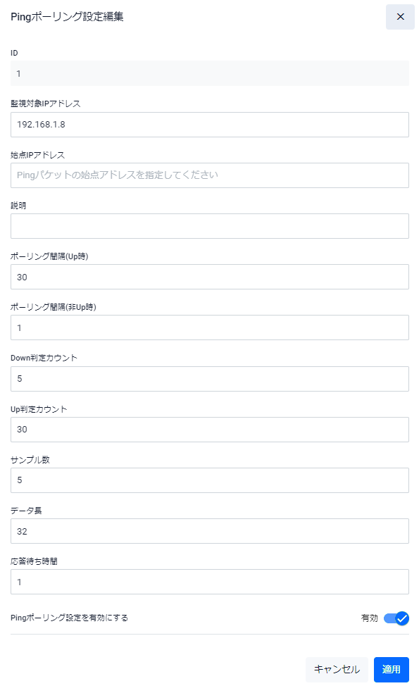 | ID | 編集対象のPingポーリングIDが表示されます。変更はできません |