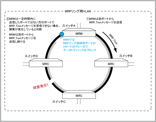 | リング障害を検出するため、MRMが定期的に2つのポートから送出するメッセージ。MRMは、一定の時間内に送信したポートではない方のポートでMRP_Testメッセージを受信できなかった場合、リングに障害が発生したと判断する。障害発生中もMRMはMRP_Testメッセージを送出し続け、一定の時間内に送信したポートではない方のポートで再び受信した場合にリングが障害から回復したと判断する | |