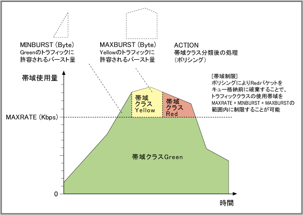 | Red | 使いすぎ | 帯域割り当ての優先度は最低。キューへの格納前に破棄、あるいは、キューが混雑したとき優先的に破棄 |