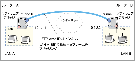 ここでは、下記の構成において、ルーターA・Bのeth1同士をリモートブリッジ接続し、タグなしフレームのブリッジングを行います。