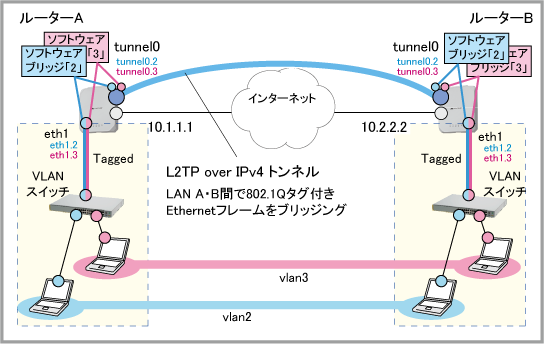 ここでは、下記の構成において、ルーターA・B間でvlan2、vlan3のタグ付きフレームをブリッジングします。