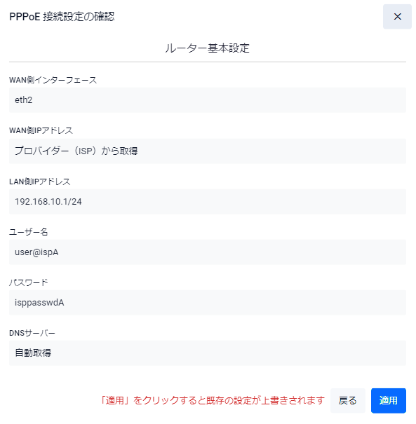 Noteすでにインターネット接続が設定済みの状態で「適用」をクリックすると、ランニングコンフィグ上の既存設定が消去され、新たに設定した内容で置き換えられます。