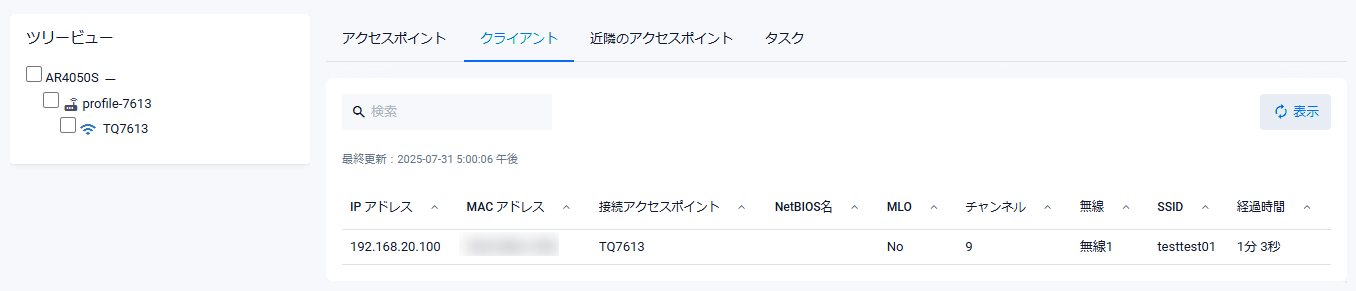 Note無線クライアント情報を表示させるには「表示」ボタンを押してください。なお、本ページで表示される情報は管理下アクセスポイントからクライアント接続情報に更新があるごとに送られてきます。