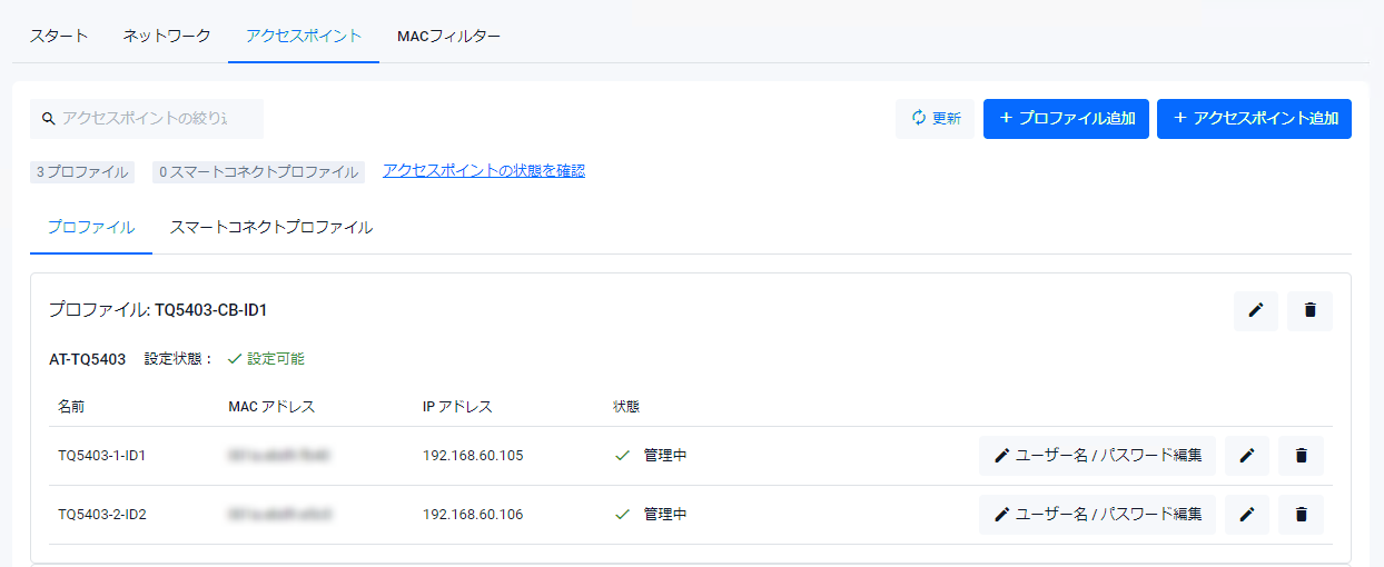 NoteAPプロファイルに割り当てて使用する場合は本画面に表示されるMACフィルター自身のアクションは使用されず、APプロファイルの「MACフィルター」、「MACフィルター - アクション」設定が使用されます。