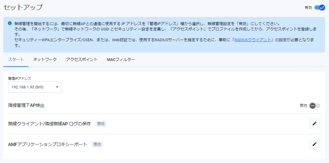 Note本設定はAWCプラグイン側から行われるため、無線管理画面からは操作しないでください。なお、AWCプラグインから操作できないといったトラブルシューティング時など、一時的に動作の停止が必要な場合は、ご使用に際して弊社技術担当にご相談ください。