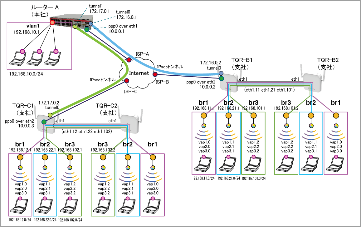 | LAN側(br1)IPアドレス | - | 192.168.11.1/24 | - | 192.168.12.1/24 | |