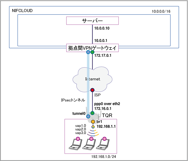 本例では本製品のLAN側サブネットとNIFCLOUDの仮想サブネットをL3VPN接続してIPトラフィックをルーティングします。