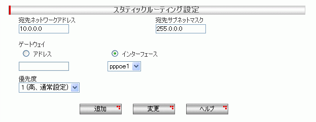サービス事業者のネットワーク情報が「10.0.0.0/8」と通知されていますので、各項目を以下のように設定して[追加]を押します。