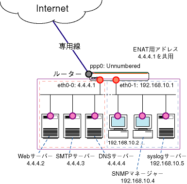 専用線を使ってインターネットサービスプロバイダー(ISP)に接続します。この例では、LAN側を2つのサブネットに分割し、一方をグローバルアドレスで運用するサーバー用、もう一方をプライベートアドレスで運用するクライアント用とします。クライアントはダイナミックENAT経由でインターネットにアクセスします。また、ファイアウォールを使って外部からのアクセスを原則拒否しつつ、特定のサーバーだけを外部に公開します。さらに、ファイアウォールのイベント通知機能をオンにし、ポートスキャンなどの不正行為を受けたときにSNMPトラップで通知するように設定します。また、ファイアウォールのログをsyslogサーバーに転送するよう設定します。