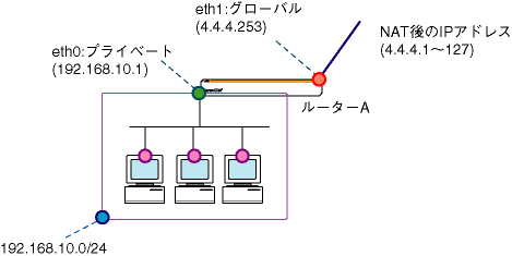 Ethernet上でNATを使用する場合、NAT後のグローバルアドレスとして、グローバル側インターフェース(図ではeth1)のIPアドレスと異なるアドレスを使用するためには、NAT用グローバルアドレスをルーターのARPテーブルに登録する必要があります。