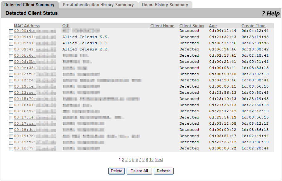 | Delete All | すべての未認証クライアントを「Detected Client」データベースから消去します。その後クライアントが再度検出されると、改めてデータベースに追加されます。 |