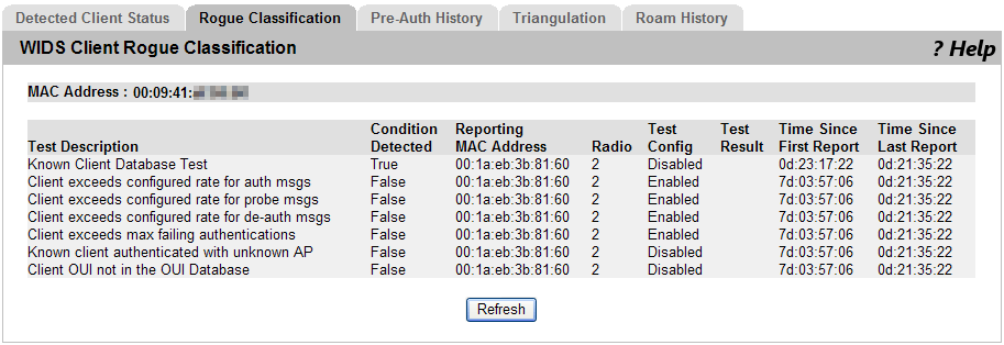 | Test Result | このテストが、デバイスをローグであると報告したかどうかを表示します。デバイスはこのモードで動作を許可されているため、いくつかの場合、テストは「有効である」という肯定的な結果を報告し、ローグとしてレポートしないかも知れません。 |