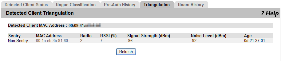- Detected Client Summary(検出クライアントの情報) - Detected Client Status(検出クライアントの詳細情報) - Rogue Classification(WIDSによるローグクライアントの分類) - Pre-Auth History(検出クライアントの事前認証履歴) - Triangulation(検出クライアントのトライアングレーション) - Roam History(クライアントのローミング履歴) - Pre-Authentication History Summary(事前認証のサマリー情報) - Roam History Summary(検出クライアントのローミング履歴概要)