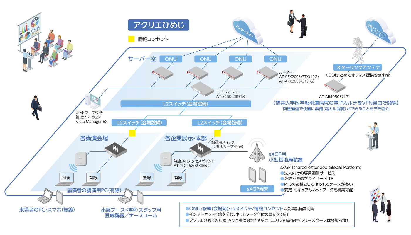 アライドテレシスは本大会において、企業展示および共催セミナー(スイーツセミナー)へ参加するとともに、来場者用や運営用、Web LIVE配信用ネットワークの構築とその運用サポートを担った。