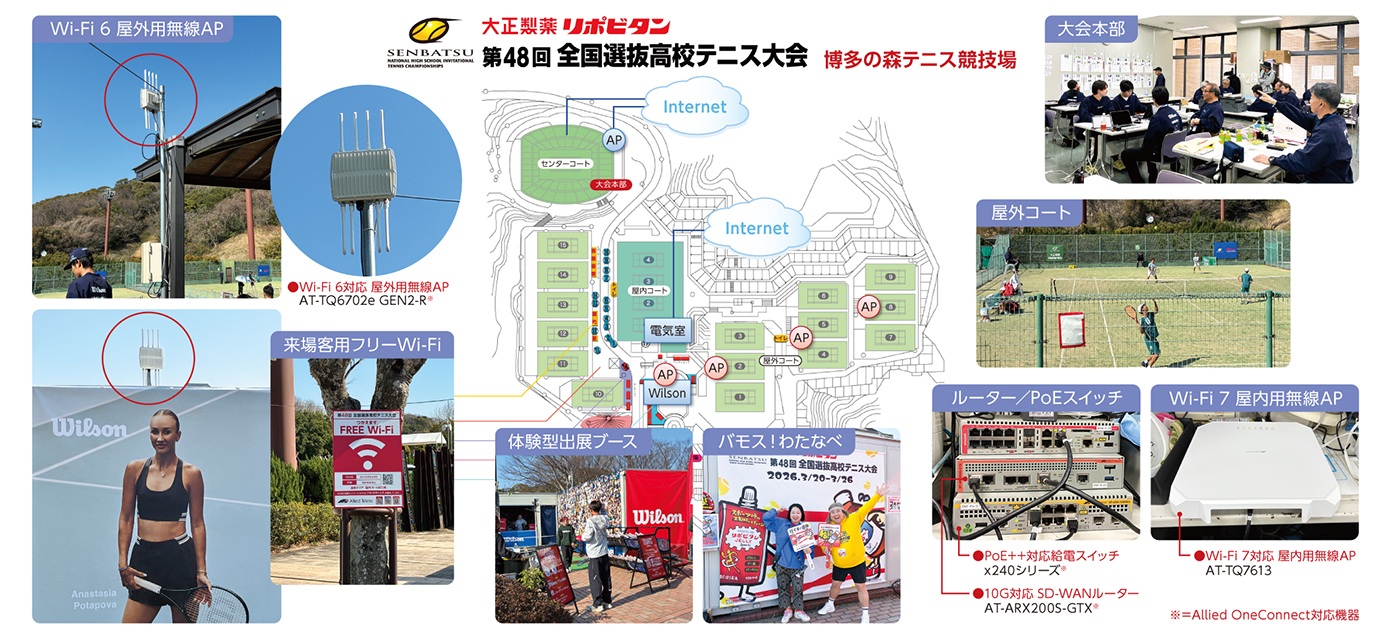 青空のもと、福岡の博多の森で開催された第48回全国選抜高校テニス大会。アライドテレシスは、本大会において大会用フリーWi-Fiおよび会場用ネットワークを構築し、大会運営を支援した。屋外かつ複数会場というイベント特有の環境においても、安定して快適に利用できるネットワーク基盤を提供。昨年に続き、クラウド管理型プラットフォーム「Allied OneConnect」を活用することで、現地でのセットアップ作業を省力化した。短期間で設営と撤去が行われる大会環境においても、クラウド技術を活用することで、円滑な大会運営を支えている。(2026年4月公開)