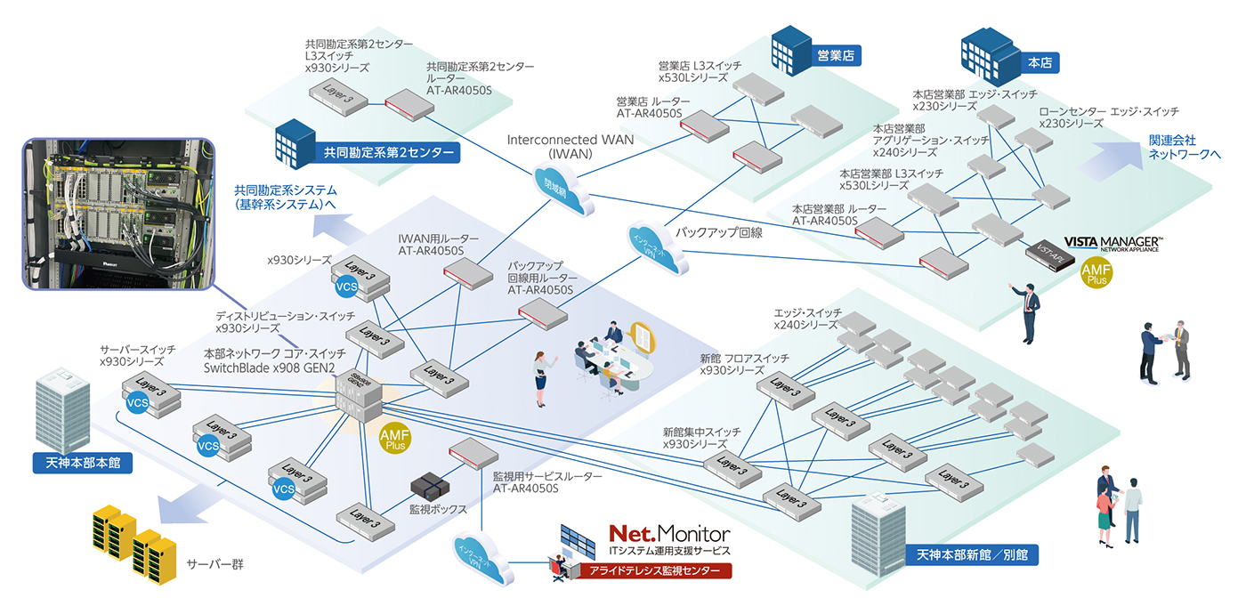 本部ネットワークの中核には、勘定系・情報系を含む全システムの通信を集約するコア・スイッチ「SwitchBlade x908 GEN2」を配置。この機器をAMF PLUSのマスター(管理用スイッチ)として据え、営業店側ではネットワーク統合管理アプライアンス「Vista APLシリーズ」を活用した運用体制を構築。さらに運用支援サービス「Net.Monitor」を組み合わせることで、銀行業務を止めないための運用基盤を支えている。