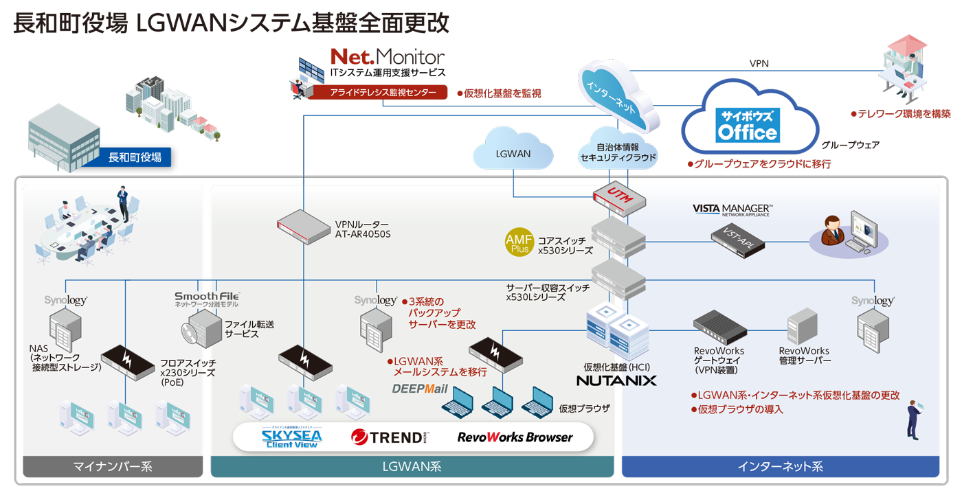 業務基盤についてはNutanix社のHCI(Hyper-Converged Infrastructure)を前提としたサーバー仮想化基盤を導入。従来はLGWAN系、マイナンバー系、インターネット系の各系統でVDIを利用していたが、仮想ブラウザを採用した。仮想化基盤の監視にはアライドテレシスの運用支援サービス「Net.Monitor」を組み合わせ、運用の安定化を実現している。当初は基盤全てをNutanixで更改することを想定していたものの、予算面などを踏まえてNutanixとSynologyのNASを併用する形で設計とコストを最適化した。