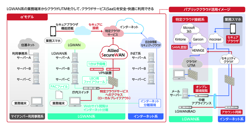 Allied SecureWANは、統合脅威管理(UTM)機能やローカルブレイクアウト機能をパッケージ化したサービスで、利便性とセキュリティを両立したクラウド利用を実現する。三層分離を前提にしながらMicrosoft 365などのクラウドサービスを業務端末から安全に活用できる「α’モデル」のネットワーク構築が可能で、すでに約10の自治体で導入・運用が始まっている。