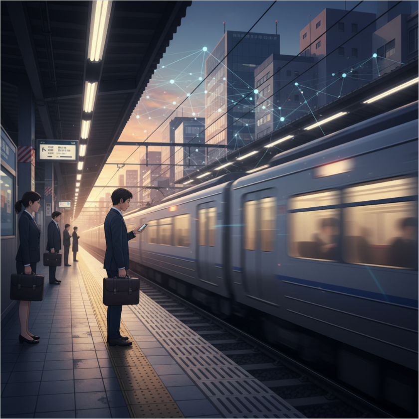運行情報が表示され、改札が反応し、スマートフォンに最新情報が届く。こうした一つひとつが滞りなく動いているから、私たちは深く考えることなく電車に乗ることができます。どこかで情報が止まれば、その流れはすぐに乱れてしまうのです。