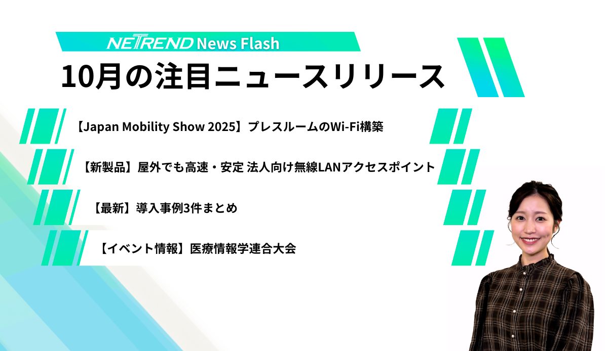 世界が注目するモビリティの祭典をサポート!今回の「NETREND News Flash」では、 “Japan Mobility Show 2025”でWi-Fi環境を構築した話題をはじめ、10月のニュースから特に注目のトピックスを分かりやすくお届けします。