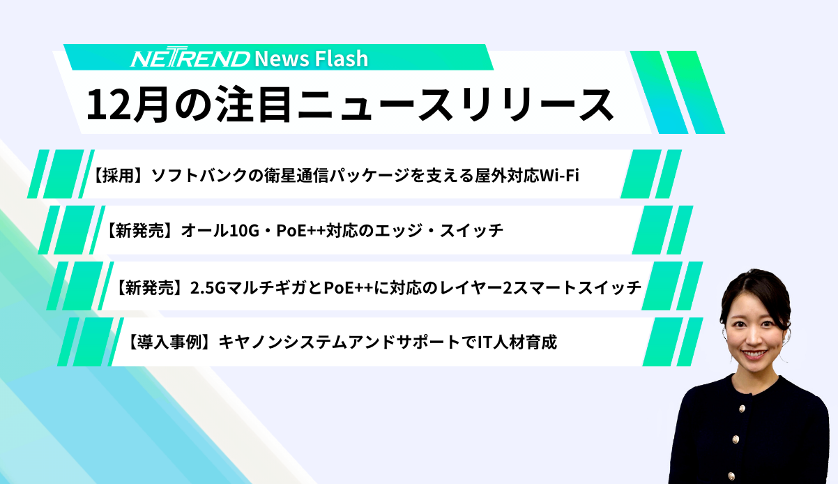 12月、ネットワークの現場ではどんな動きがあったのか。今月の「NETREND News Flash」では、ソフトバンクの衛星通信パッケージ「SatPack」にアライドテレシスの屋外用Wi-Fiアクセスポイント「AT-TQ6702e GEN2」が採用された話題をはじめ、オール10G・PoE++対応のエッジ・スイッチ「AT-SE540L-28XHm」や導入事例など、押さえておきたいニュースをコンパクトにまとめました。