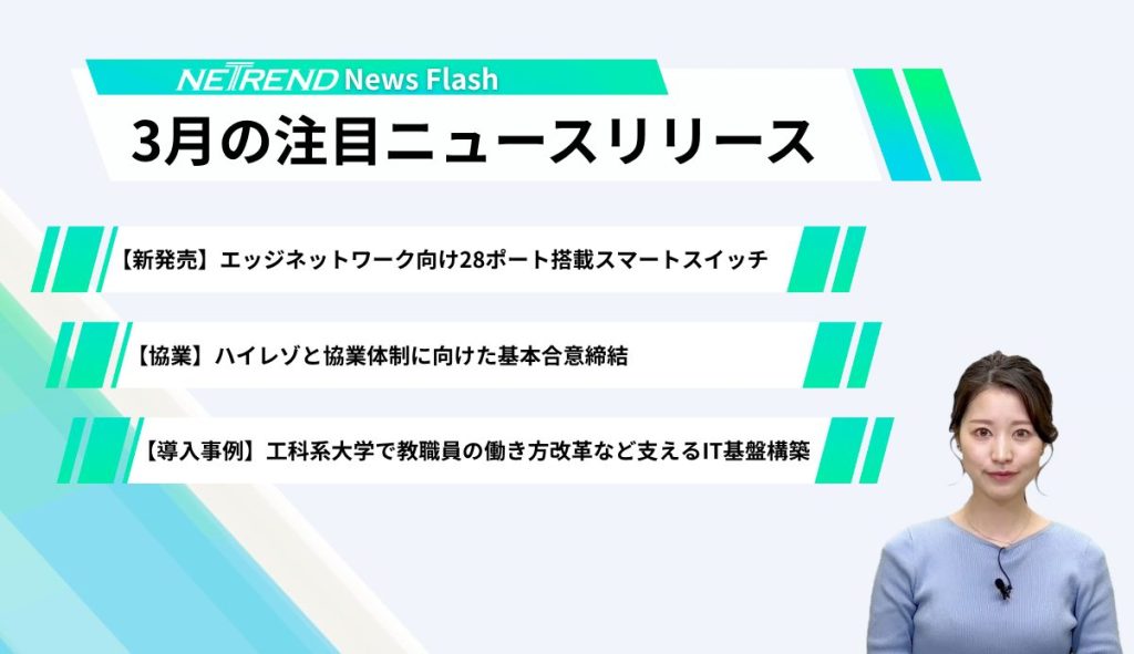 「NETREND News Flash」は、アライドテレシスが日々発表しているニュースから毎月注目の話題をピックアップしてお伝えする動画コンテンツです。