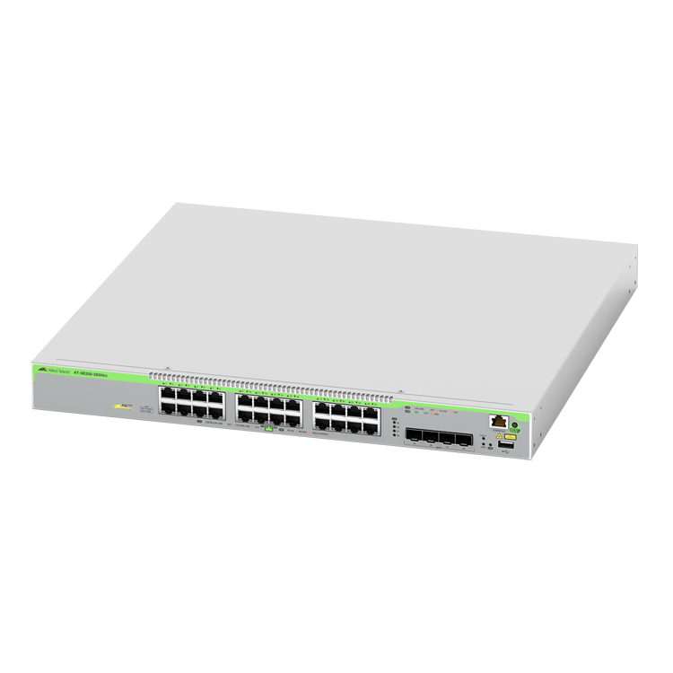 AT-SE250-28XHmは、PoE++に対応したダウンリンクの10Gbpsポートを24ポート備え、アップリンクはSFP+は4スロット装備したレイヤー2plus 10ギガビット・インテリジェント・スイッチです。