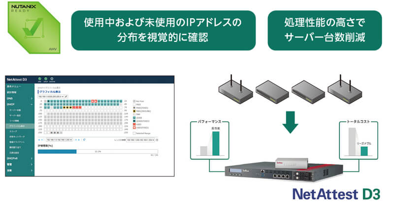DHCPサーバーとDNSサーバーを提供することに特化した専用アプライアンスです。他社製品と比べ最大10倍のIPアドレス払い出し能力を有すなど処理性能が高いため、物理筐体を減らし、コストと運用負担の軽減につなげることができます。