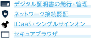 デジタル証明書の発行・展開から無線LANやリモートアクセスの認証まで、ネットワークへの不正アクセスを防ぐ機能を網羅したクラウドサービスです。さらに、各クラウドアプリのログイン認証強化やシングルサインオン、セキュアブラウザ機能を搭載しており、現在のビジネスシーンに最適なセキュリティ対策を提供します。