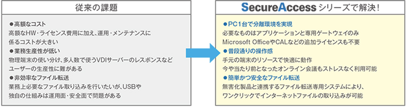 公共・金融・医療業界等で、リスク対策として一般化したインターネット分離。従来は物理分離や、VDIなどの画面転送方式が一般的でしたが、コスト面・運用面に課題が残ります。SecureAccessシリーズは、安全性・利便性を担保しながら、これらの課題を一挙に解決します。