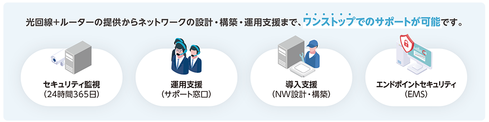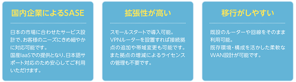 アライドテレシスのSASEである“Allied SecureWAN”は、クラウド型のメリットを生かしたUTM(Unified Threat Management/統合脅威管理)機能と、安全な拠点間接続やインターネット接続を実現するネットワーク機能で、統合されたセキュアなWAN環境を提供するソリューションです。国内ベンダーとしてお客様のニーズに寄り添い、導入から運用までワンストップで支援いたします。