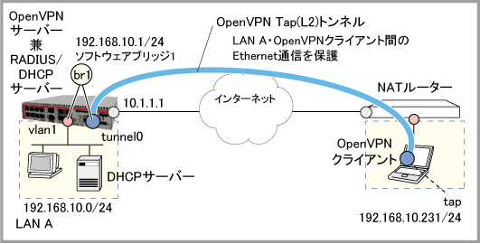 NoteAndroid版およびiOS版クライアントではTap(L2)モードでのOpenVPN接続が未サポートのため、本構成は使用できません。