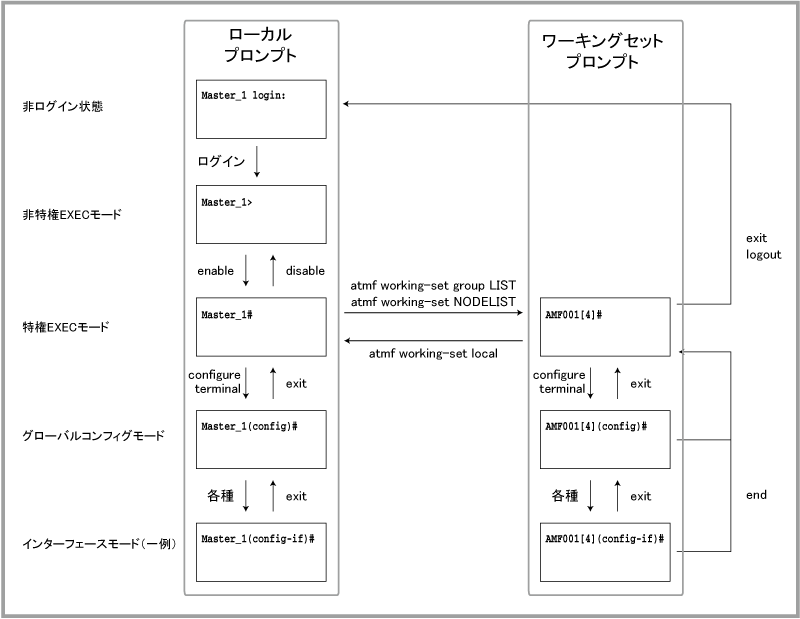 Noteワーキングセットプロンプトの特権EXECモードでexitコマンドを実行した場合はマスターのCLIからログアウトします。ワーキングセットプロンプトからローカルプロンプトに戻る場合は、exitコマンドを実行するのではなく、atmf working-setコマンドでgroup localを指定してください。