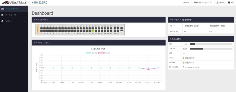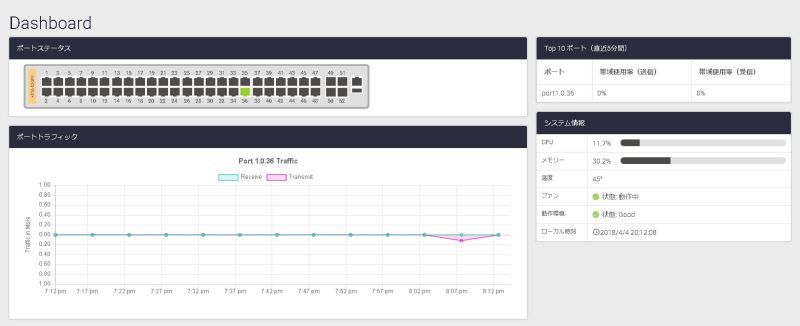 ログイン直後は、Web GUIのホーム画面であるダッシュボード画面が表示されます。
