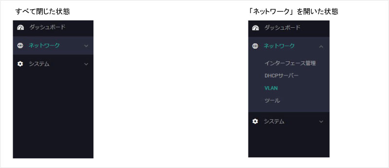 インターフェースなどの管理画面やPing、Tracerouteなどのツール画面に移動するためのメニュー項目を開閉します。