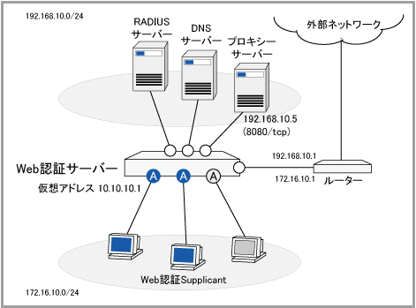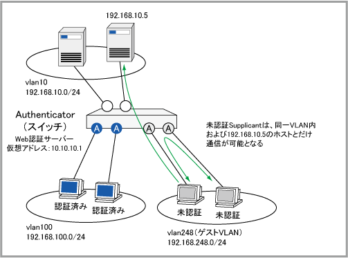 なお、Web認証ではHTTP/HTTPSを使って認証を行う関係上、認証前であってもAuthenticator・Supplicant間でIPの通信ができる必要がある。通常これはWeb認証用DHCPサーバー機能、またはDHCPサーバー機能を使ってSupplicantに一時的なIP設定情報を供給することで実現する。