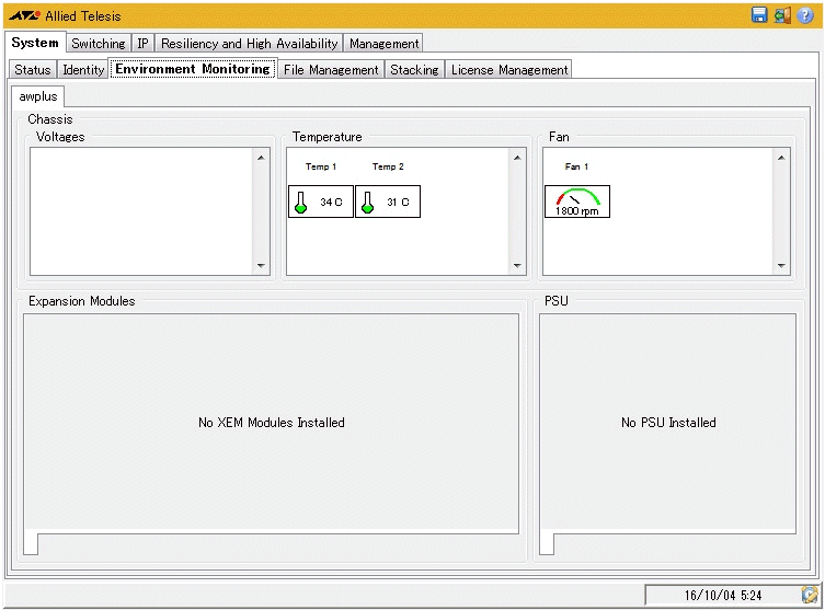 | Chassis | 本体の電圧状態(Voltage)、内部の温度状態(Temperature)、ファンの状態(Fan)が表示される |