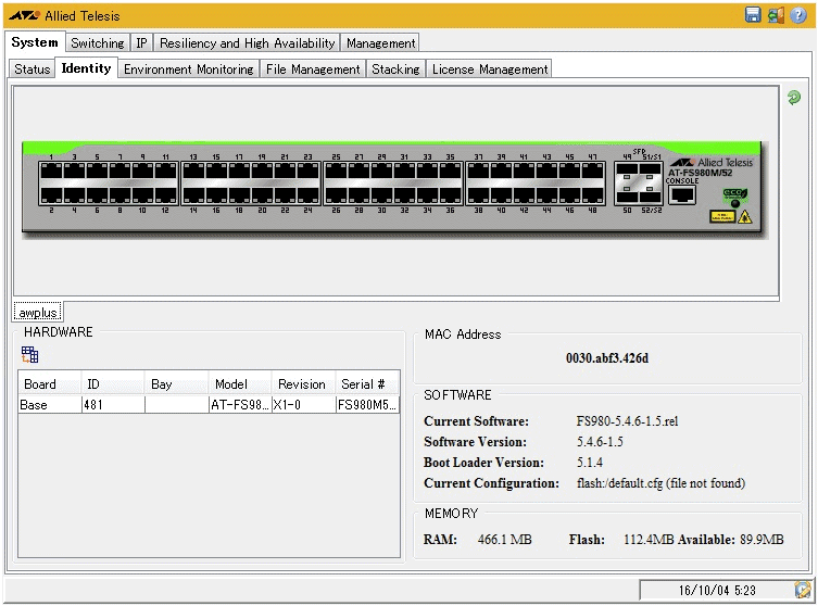 | HARDWARE | スイッチ本体のハードウェア情報を表示する。表示されるのは、製品(部品)の種類、種類を示すID番号、スロット番号(本製品ではつねに非表示)、名称、ハードウェアリビジョンやシリアル番号 |