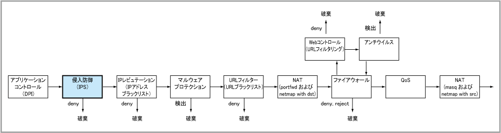 侵入防御(IPS)機能の処理は、ブリッジング用、ルーティング用の両インターフェースで受信したパケットに対して行われます。